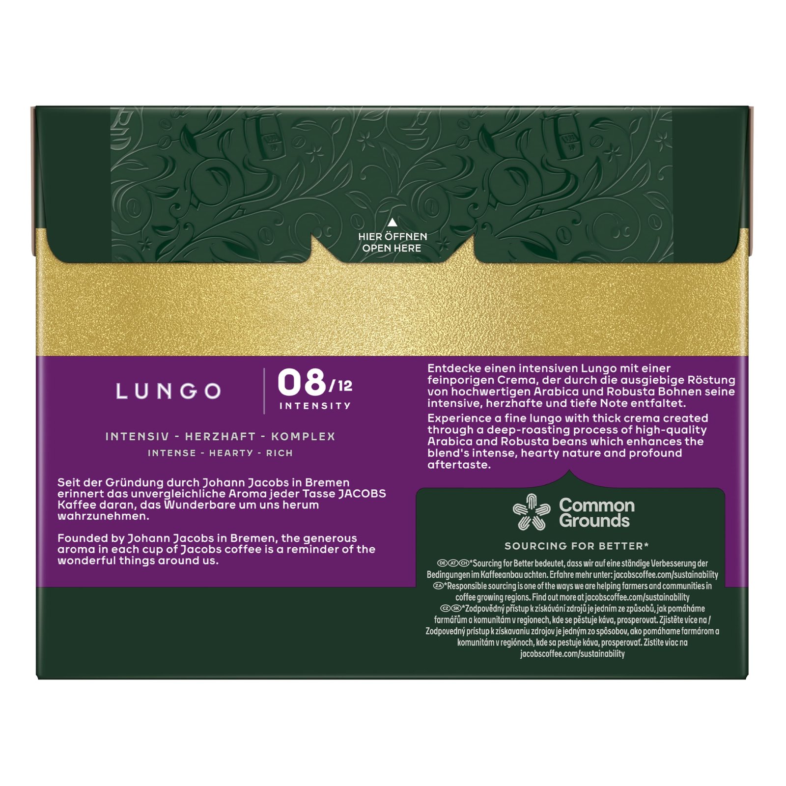 Dieser Lungo zeichnet sich aus durch seine ausgiebige Röstung von hochwertigem Arabica und Robusta – so entfaltet dieser Blend seine intensive, herzhafte und tiefe Note. Erleben Sie einen intensiven Lungo mit einer dicken und feinporigen Crema – dank der neuen Aluminium Kapsel von Jacobs, die jetzt noch besser die intensiven Aromen der ausgewählten Jacobs Kaffeebohnen schützt.